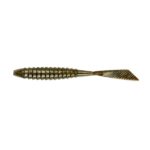 It features qualities of a hand-poured lure — soft, supple plastic with a flat bottom that provides a horizontal profile on the hook, and a flat, thin tail flare.