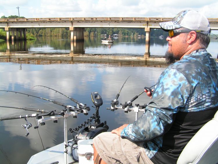 Turner likes to use an eight-pole spider rig technique with two fishermen in the front of the boat manning four poles each.