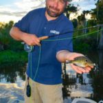 He uses 10-pound test fluorocarbon leaders because of where he fishes, allowing him to yank the fly out of the bayou’s lush growth of trees and grass when it hangs he misses his target. Most people use 2- or 4-pound test lines for bream fishing, he noted.