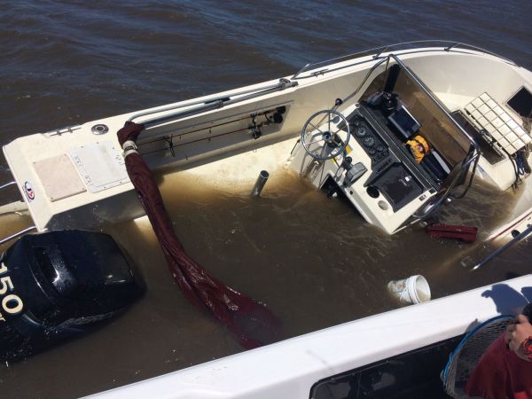 “They couldn’t pump the water out, and the boat just filled up. They were trying to get over to the bank, and they were lucky enough to get over into some shallow enough water to where the boat didn’t completely sink. He’s sitting in about 2 feet of water. They were literally maybe 50 feet from making it to the bank, but they couldn’t quite get there.”
