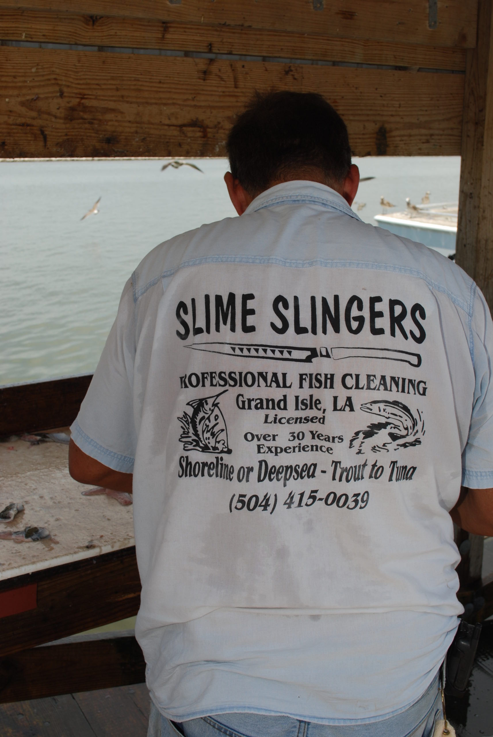 The rugged man flipped a business card to the fishermen at the International Grand Isle Tarpon Rodeo. It displayed a bowie knife in its center and read Slimeslingers Professional Fish Cleaning: Willing to Travel.
