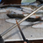 He holds up a filleted trout and passes the blade of his knife behind it. It can clearly be seen through the meager meatless rack.