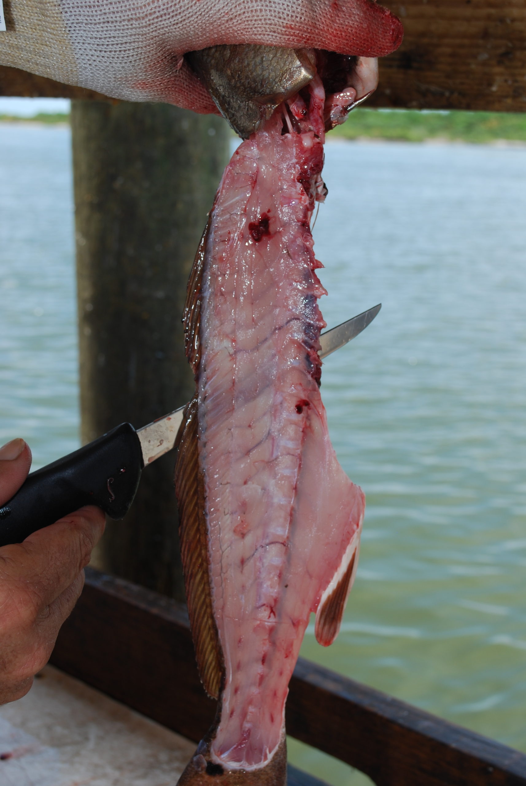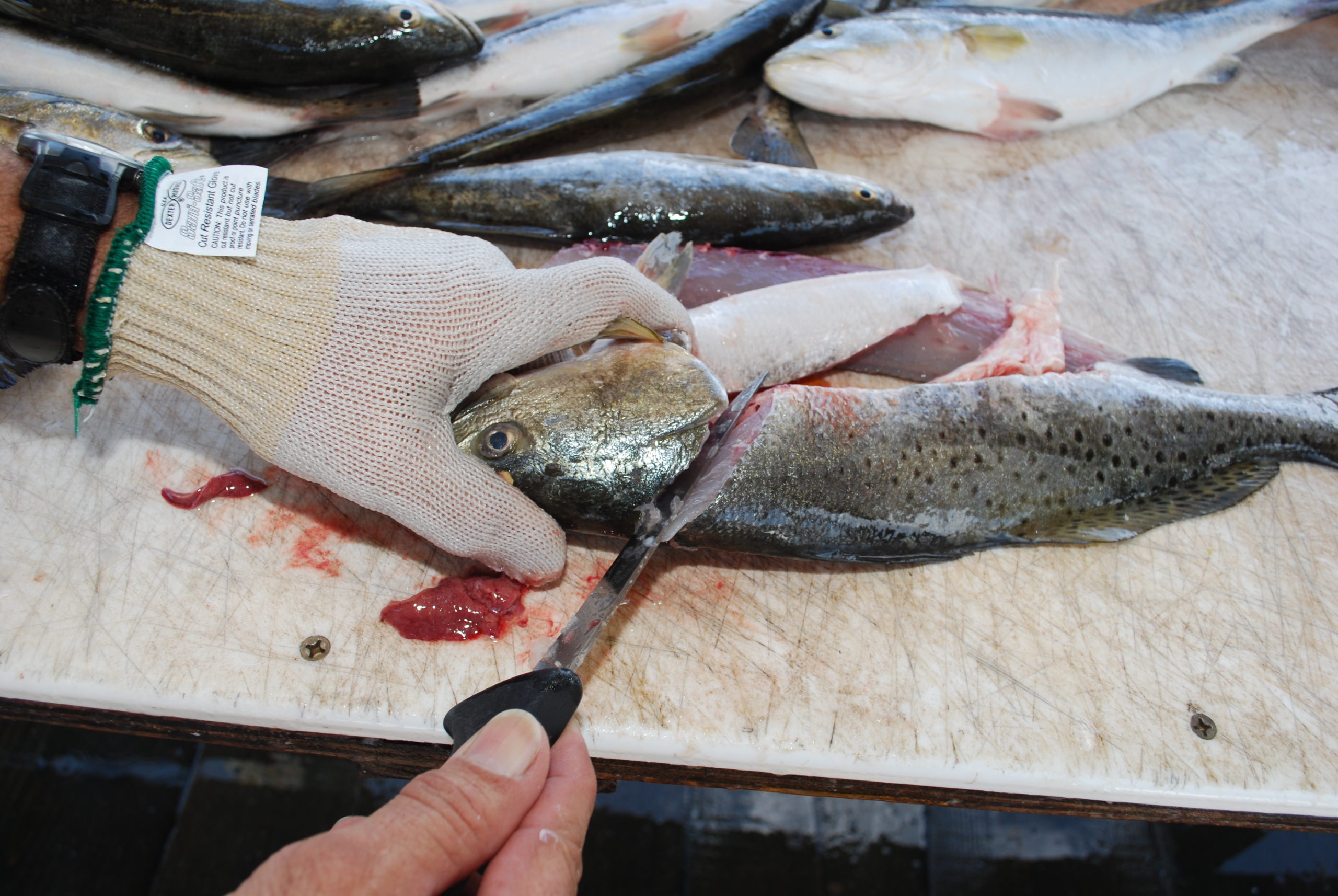 Richoux cleans more trout, both specks and whites, than any other species. The first cut on every trout begins the same way. He turns the fish on its back and with the cutting edge facing the tail, stabs it just beneath the pectoral fin on one side. The blade is then drawn through to the anus, effectively separating the guts, eggs (or testes) and most importantly the tough, white air bladder from the rest of the fish. He explains that this cut also gets the stomach juices of the fish away from the flesh.