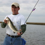 “The fish will just sit there and let the bait come to them. The coming front will trigger them to feed. They’ll get right on the edges of the shallows where the deeper pass or bayou is tapering up,” said Thomason. “My deal is to fish the baits under a cork — we’re imitating shrimp that are coming through the passes and bayous — about a third way to whatever the depth of the water is. So in 4 feet of water, I’ll fish a foot and change down.