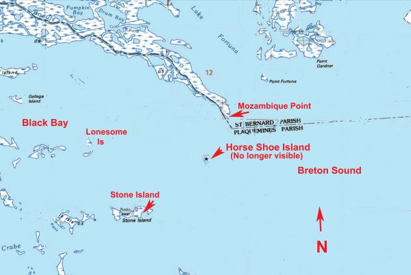 The small island called Horseshoe was located in the eastern part of Black Bay by the Breton Sound about 1.25 miles at a bearing of 215° Mag from the Aid to Navigation light Red No. 2 by Mozambique Point.