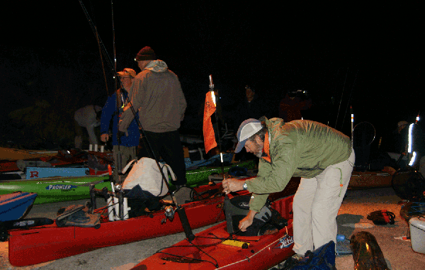 After checking in and getting their lures, kayaks will be launched and bunched up in a holding area, awaiting the group start at 5:30 a.m. (“blast-off” would be an oxymoron)