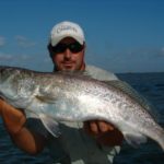 In July, he concentrates on rigs such as those found out of Main Pass, around Sandy Point or in West Bay. He uses a sliding cork as well as a light Carolina rig to present his shrimp and croakers.