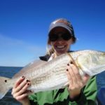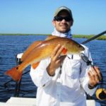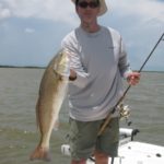 Finally, we all started casting — not to the point — but to the little eddie that formed around the mat of milfoil, and — WHAM! — in short order we’d all landed reds and one pretty puppy drum along with a flounder.