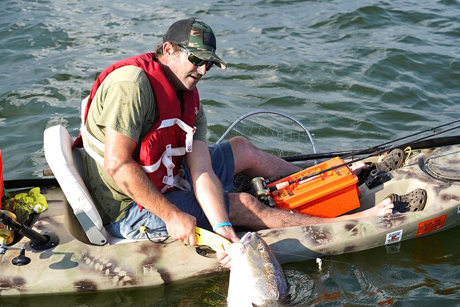 First, consider the regulations and conservation. Bull reds are now off limits to keep, but are still legal to catch. All fish over 27 inches must be released. Now is a great time for both the angler and the fish, as the milder air temperatures and lower water temperatures puts less stress on both. Bulls are hard fighters and can take a little while to land. After a quick photo op, use the kayak to pull the big red along and wash water through its mouth and over its gills. They quickly revive this way, and when they give a few kicks, you can tell they are ready for release. Gentle handling and minimizing time out of the water ensures that they swim away healthy.