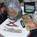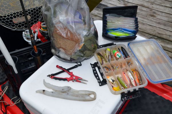 Fishing tackle is also stored in the crate in small boxes and pouches. Williams is especially partial to Plano-brand boxes because of their waterproof rings.