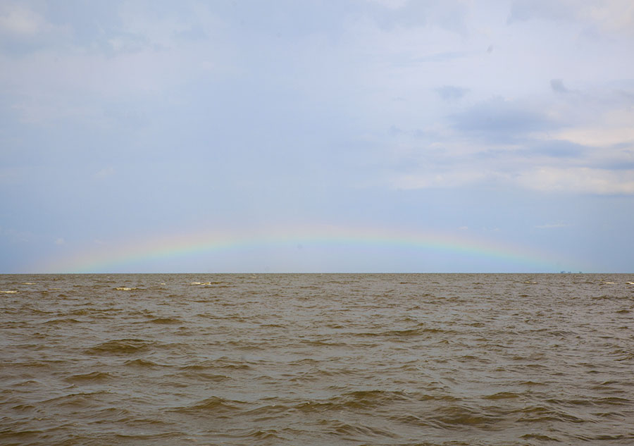 When we left the dock Sunday afternoon, the weather radar on Pellegrin’s electronics showed us surrounded by afternoon squalls like Custer at Little Bighorn. The shallow water was also a little choppy and a bit murky from the agitated atmosphere, but there was a rainbow from the afternoon sun that stretched from inshore to well offshore. If there was ever a good omen, that was it.