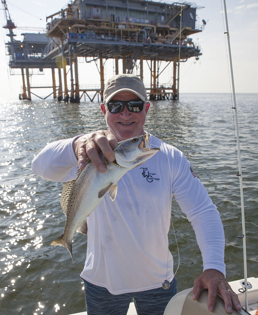 The next morning, Pellegrin briefed us over a light breakfast that we would be fishing a couple of rigs further offshore. The first thing I thought of was how that rainbow the previous afternoon had stretched for miles in the direction we would be heading. Again, we would be targeting speckled trout.