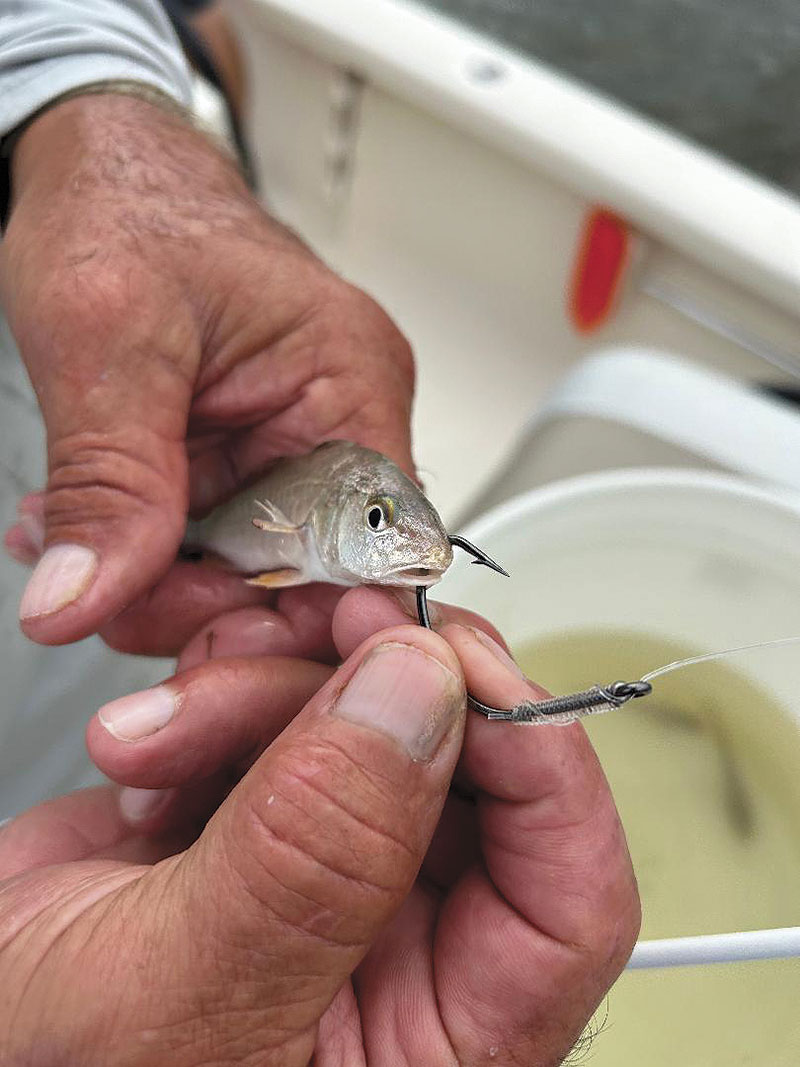 Over the years, Pellegrin has honed his skills and determined what rigs, tackle and baits work best for him and his clients, which range from novice to seasoned. What you’ll immediately notice fishing with Pellegrin is he ties all of his hooks with a snell knot.