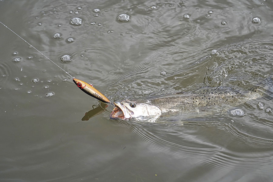 Topwater lures come in a wide variety of styles, sizes and colors. While colors are a personal preference, note that the bottom color is most important, as that is mainly what the fish sees from underneath. While lures that wake on the surface or have cupped faces for chugging and splashing certainly produce fish, “walk the dog” style lures that zig-zag across the surface are hard to beat. Learning the walking technique takes a little practice, but once learned, it becomes second nature. It is quite easy to produce various cadences with simple twitches of the rod tip in conjunction with simultaneously reeling in the slack.