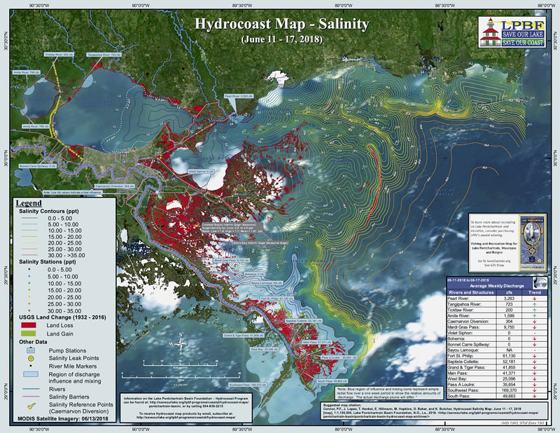 Second, the Lake Pontchartrain Basin Foundation (LPBF) provides hydrocoast salinity maps. The maps forecast salinity and water movement for the Lake Pontchartrain Basin and the Barataria Basin; they are an incredible resource for researchers, government officials, and anglers. They are free and can be found at https://saveourlake.org/lpbf-programs/coastal/hydrocoast-maps/.