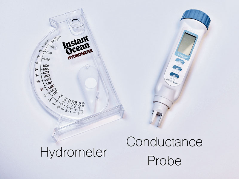 The least-expensive instrument to measure salinity is the hydrometer, which can be bought from businesses that sell aquarium supplies for about $15. I use a more-accurate device called a conductance probe, which costs about $75. The conductance readings from these instruments are easily converted to salinity values.