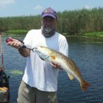 What slammed into Rouyea’s Wob L Rite gold spoon turned out to be a 28-inch redfish that looked like it had a bad case of the measles — or perhaps was the result of a chance encounter between an amorous speckled trout and a willing red.