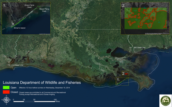 The Louisiana Department of Wildlife and Fisheries announced the reopening of state waters in the Gulf of Mexico off the beaches of Elmer’s and Grand Terre Islands effective 30 minutes before sunrise on Wednesday, Dec. 10.