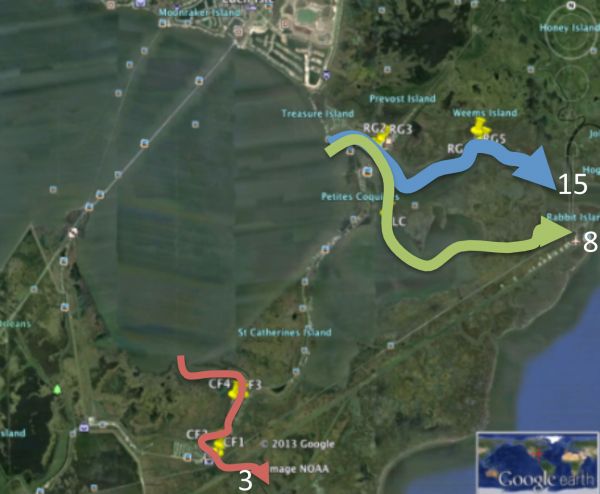 Melancon stressed that the data was still preliminary and in some cases statistically insignificant, but said it appeared that females generally travel farther than males, and larger females may travel farther than smaller females.