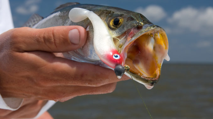 “The trout we’re catching are chasing big shrimp,” Dufrene continued. “And when the fish are eating shrimp I love throwing glow and smoke colored plastic as long as the water is clear. I mean, they got a white shrimp and a brown shrimp. It really doesn’t matter what kind of plastic you throw as long as you got the right color.”