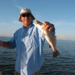 “The low river has allowed seawater into the area and — along with the good, salty water — lots of bait, and that means lots of trout. I expect to catch some good fish at the big rigs, and the smaller wells and structures through September, barring a tropical system.”