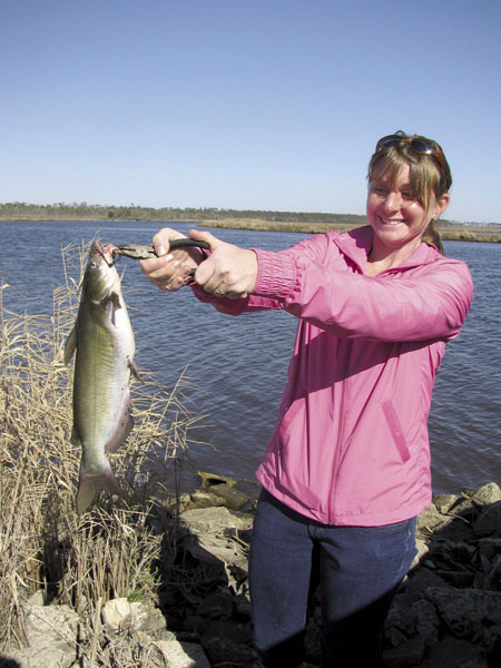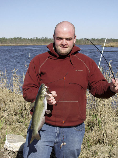 The water was still cold in the bayou itself. Those shallow duck ponds warm up quickly under the afternoon sun with no clouds. So the water draining out of them into a deeper cut made a perfect fishing spot. And believe me, tangling with a 4-pound channel cat on light spinning tackle in shallow water beats the heck out of cranking them up from the bottom of Pass Manchac.
