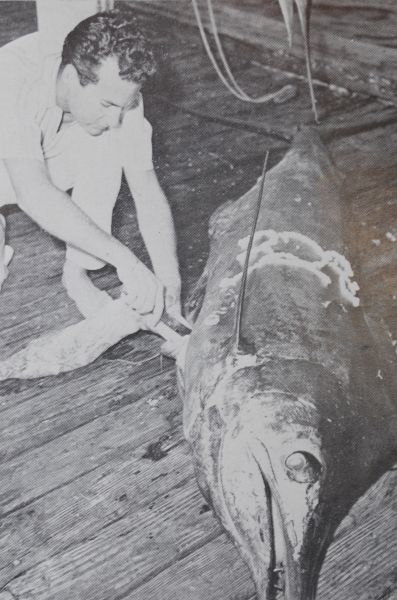 John Lauricella, Sr., owner of the All American landed a 7 ½-foot white marlin weighing 50 pounds, the first one ever caught by rod and reel off Louisiana.