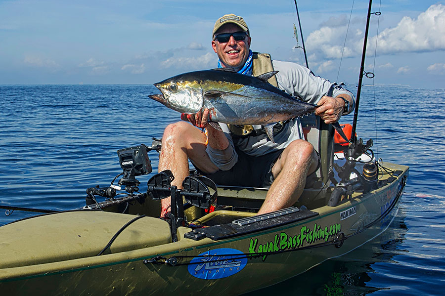 Of course, finding a rip or weed-line is also a great way to kayak fish offshore. Trolling along these areas can be productive for a variety of pelagic species and the thrill of catching a big tuna, king, mahi or even a wahoo from the kayak is crazy wild. A simple wire “stinger rig” hooked to a dead cigar minnow slow-towed 30 yards behind the yak attracts almost anything that swims. If you see active bait pods or birds working, heavy duty topwater baits or large spoons will usually draw a strike.