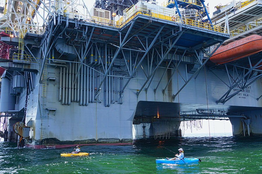 Fishing near rigs takes some planning and attention to waves and currents. You don’t want to end up inside the legs of the rig, especially if conditions are a bit sporty. Of course, that’s exactly where the fish will try to take you in effort to break free. Pedal kayaks are best suited for this type of fishing. With your hands tied up on your rod and fighting the fish, the pedal system is necessary to move the kayak away from the structure where you can continue the fight out in open water. These rigs are working 24/7 and you always need to be on the lookout for any dangerous activities as well as supply boats accessing the rigs with equipment and personnel.