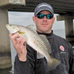 A little over a mile from the boat launch, Barbera and Grunewald began probing the bridge’s pilings with soft plastics on jigheads. Barbera piloted the boat with his trolling motor to allow him to fish both upcurrent and downcurrent on both spans, as well as under the spans. He was looking for a pattern about where the speckled trout were holding and feeding.