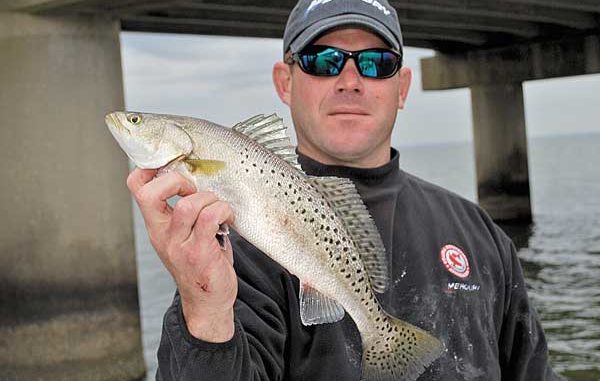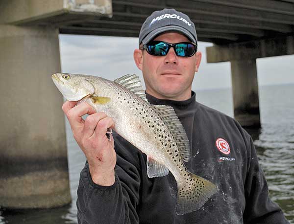 His casts are usually made to drop lures as close to pilings as possible. After the lure settles to the bottom, he gives it two or three short jigs, and lets it settle again before repeating the process several times. On strong tides, he says that trout will either be right on the piling or a good ways off the piling, sometimes as much as 10 or 12 feet.