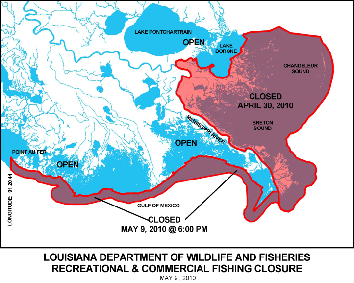 To this point, recreational fishing had been closed only east of South Pass, but the agency said LDWF Secretary Robert Barham announced the new closure (which includes all commercial fishing) today in response to the westerly movement of oil from the Deepwater Horizon leak.