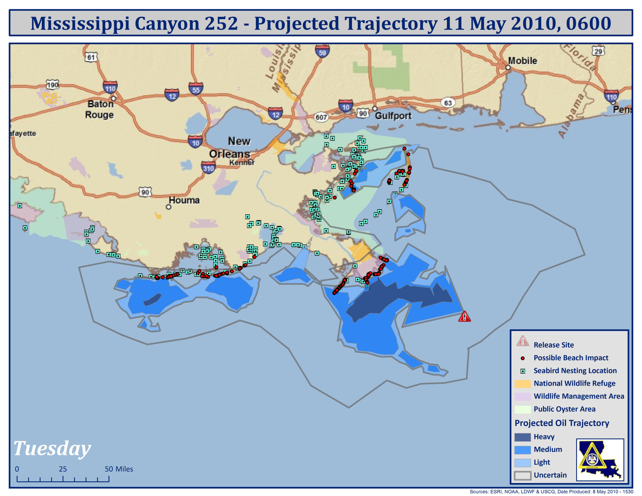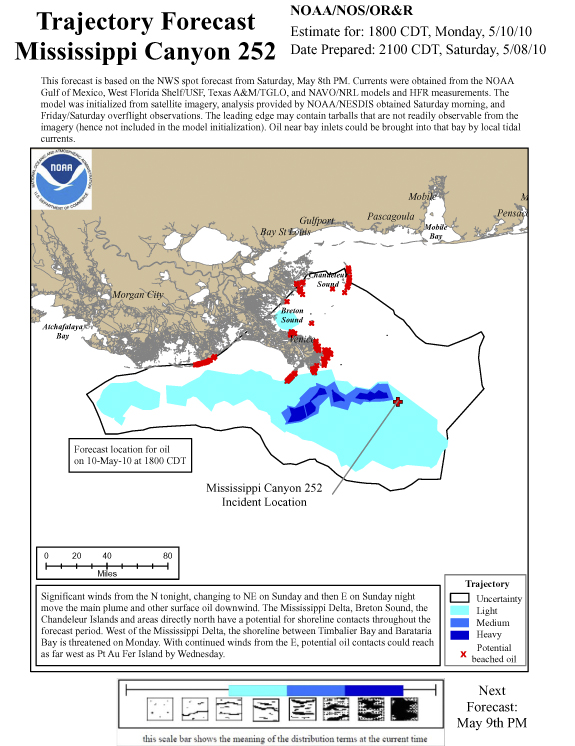 Forecasts show large masses of oil moving toward the beaches between the river and Pointe Au Fer over the next two days, with Tuesday’s forecast predicting oil on beaches all along the coastline. See the related forecast images for details.