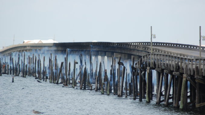 The Louisiana Department of Wildlife and Fisheries, in cooperation with the Grand Isle Port Commission, the Town of Grand Isle and the US Coast Guard, is assisting in the clean-up efforts following the fire that destroyed a major portion of the Caminada Pass Bridge in Grand Isle.