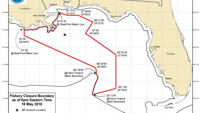 As a precaution, however, Lubchenco ordered the closure of additional offshore areas to fishing, effective at 5 p.m., CDT, May 18. The closure area now covers 45,728 square miles, or 19 percent of all Gulf of Mexico federal waters.