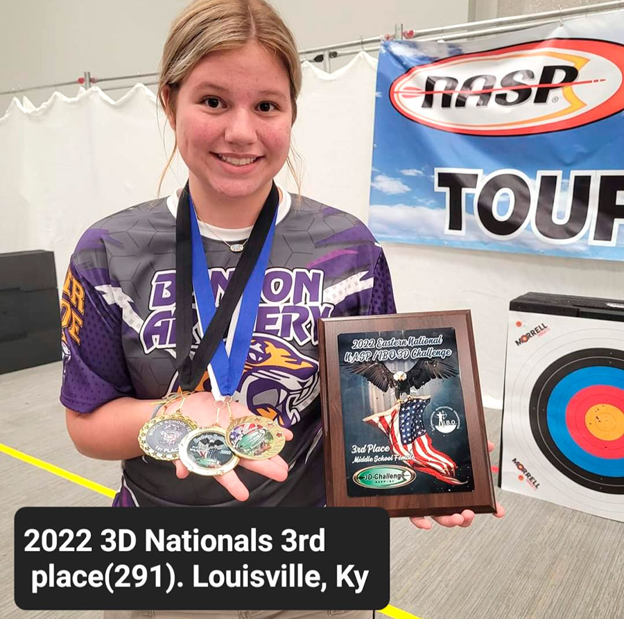 She has fond memories of her years at Benton Middle School, which included unprecedented back-to-back-to-back National Bullseye Championships. Also, O’Donohue, Long and Hammersla were ranked 1-2-3, respectively, as the top female archers in the nation, a 2,000-student field, in 2022.