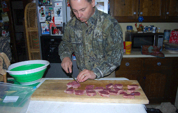 1) Trim all fat and silverskin from the backstrap, and cut against grain into 1-inch-thick steaks. Marinate overnight in zipper bags filled with buttermilk.