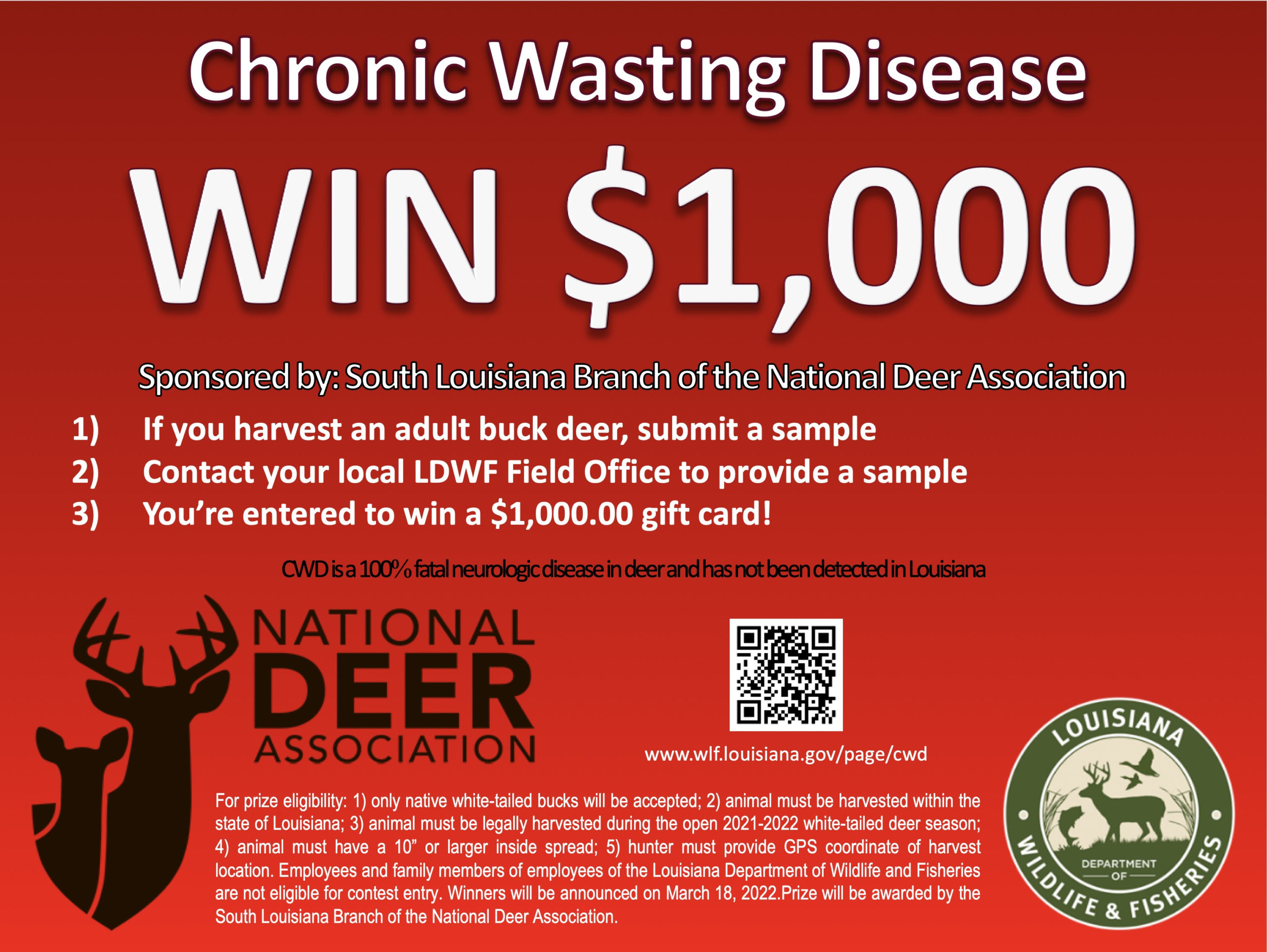The prizes are made possible by the South Louisiana Branch of the National Deer Association, assisting the efforts of LDWF to increase surveillance for CWD.