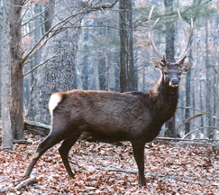 Sika deer are native to east Asian, and usually have a darker toned hide than white-tailed deer. The only weigh a maximum of about 100 pounds when fully mature. The bucks have small, elk-like antlers.