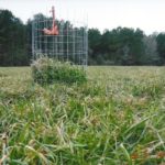 The photograph of the excluder cage in this green field clearly shows the browsing pressure that has been exerted by deer on the green forage this winter. In some cases the food plots have been so over-browsed that they look like someone just painted the dirt green; there is no plant growth.