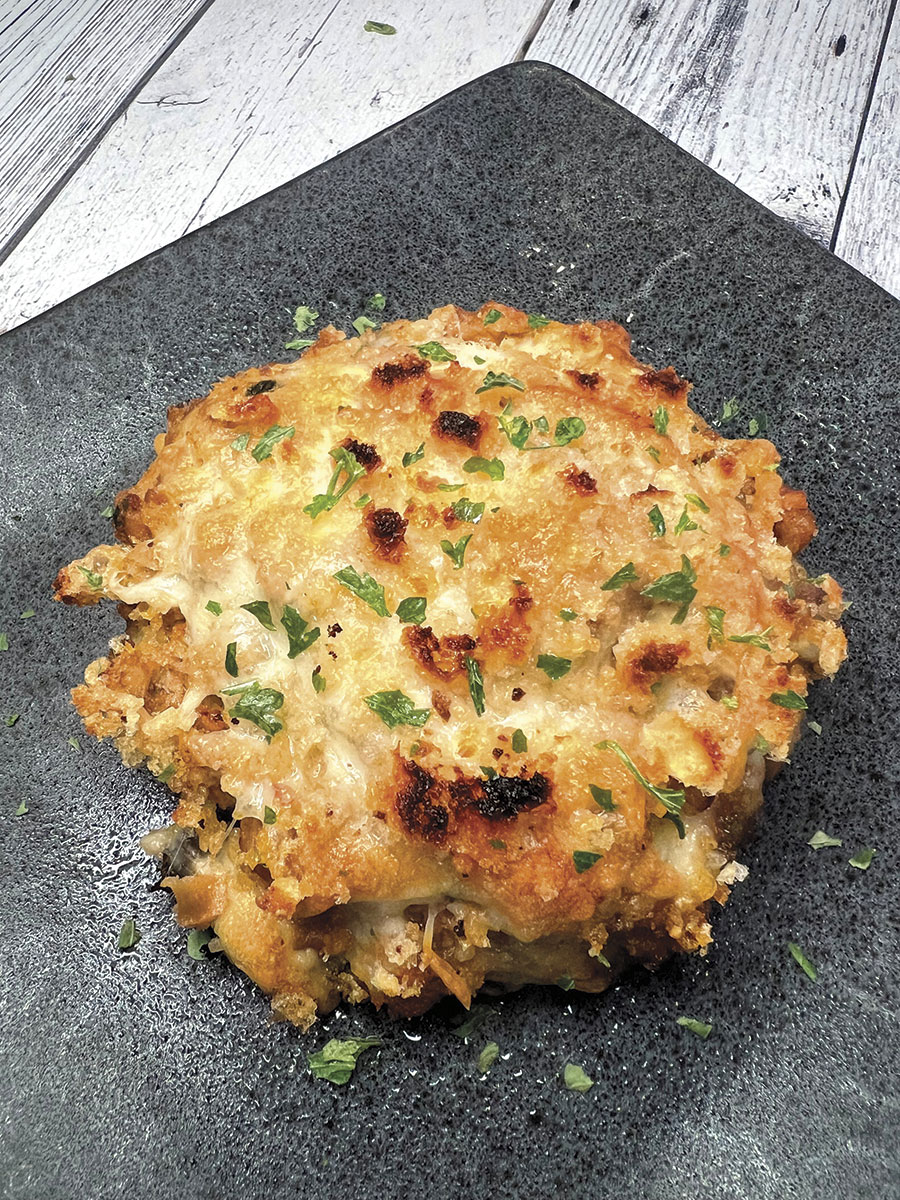 Wild pork boudin was used for this recipe, but store bought boudin can easily be substituted. The umami flavors provided by the mushroom compliment the savory boudin. The cheese not only gives the flavor profile a salty component and a bit of a bite, but it also acts as a binder keeping the filling together. The crushed pork rinds give it a crunchy texture that is pleasing to the palate.