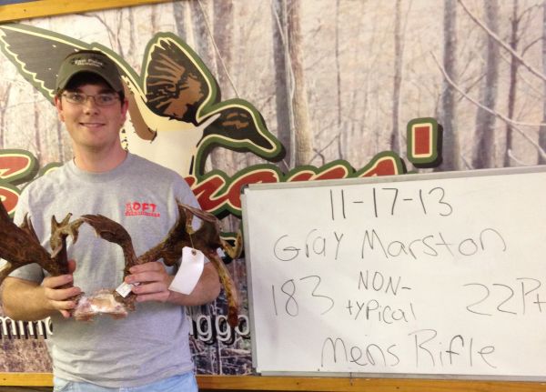 Gray Marston took the big buck’s rack to Simmons’ Sporting Goods in Bastrop on Sunday, and it was green scored at 183 inches.