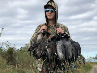 Hudson Fields holds up his first gallinule, which was retrieved by chocolate lab Cali, on a hunting trip in Houma.